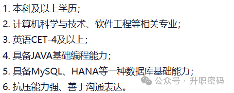 我们以MES开发工程师这个偏向技术岗来说一下,这个岗位薪资达到20-30K/月的水平,再加上多多少少的补贴总包就能到30W左右。相信很多学编程的对这个应该比较熟悉,这个岗位负责对公司MES系统功能进行二次开发,并且要是JAVA方向的伙计。以下是小胡整理出来的一些岗位要求: