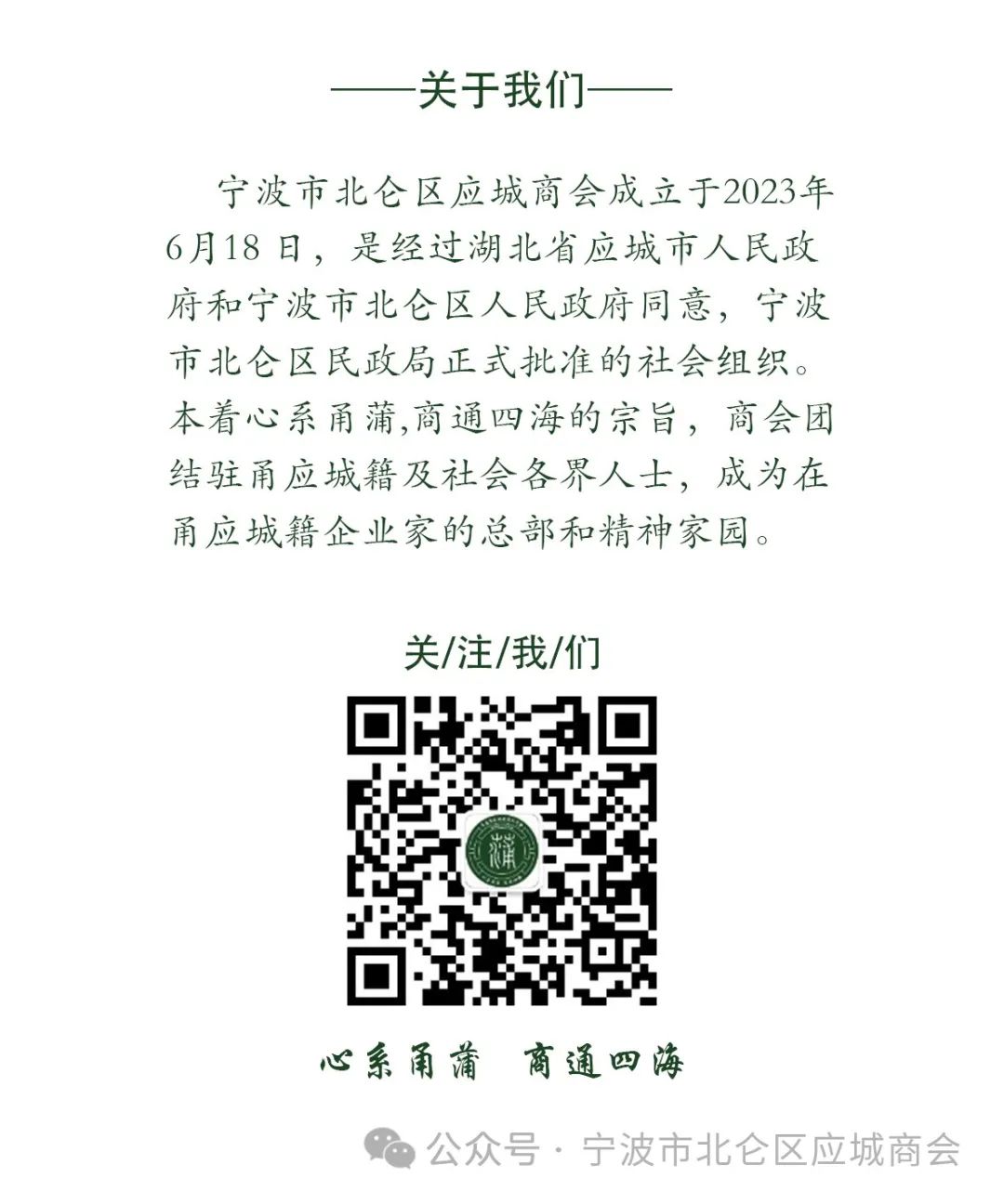 宁波应城商会将继续秉持着服务会员、服务社会的宗旨,不断推动商会的发展,为会员企业提供更多的机遇和支持。在新的一年里,商会将继续优化商会内部的决策力,行动力和感召力,为会员、为家乡做更好的服务,起到更有力的纽带枢纽作用。2024年商会也将继续加强与家乡政府的合作,积极参与招商引资工作,为家乡的经济发展贡献力量。通过不断努力,宁波应城商会将为会员企业创造更好的发展环境,为社会经济的繁荣作出更大的贡献。