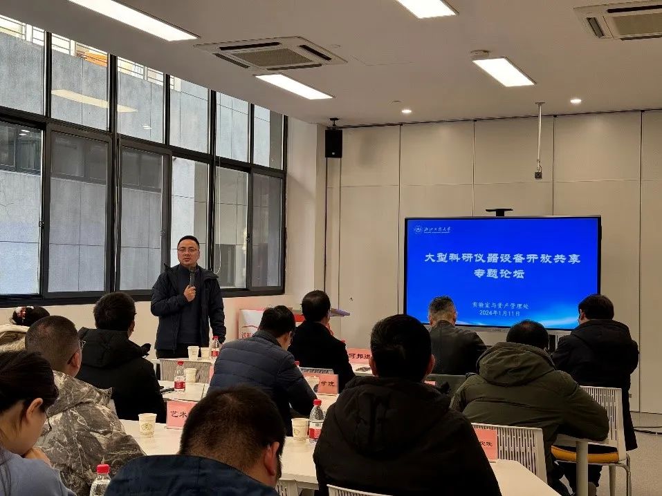 为推进学校大型仪器开放共享高质量发展,发挥专家作用“精准把脉”,破除开放共享中的难题,充分发挥大型仪器设备在教学科研工作中的作用, 1月11日,学校邀请浙江理工大学资产与实验室管理处处长何邦进、西湖大学实验室与科研设施部主任丁元胜来校做大型仪器开放共享专题报告。相关学院分管工作负责人、实验中心主任、大型科研仪器设备管理人员及资产处相关人员参加了活动。活动由资产处汤旭翔处长主持。