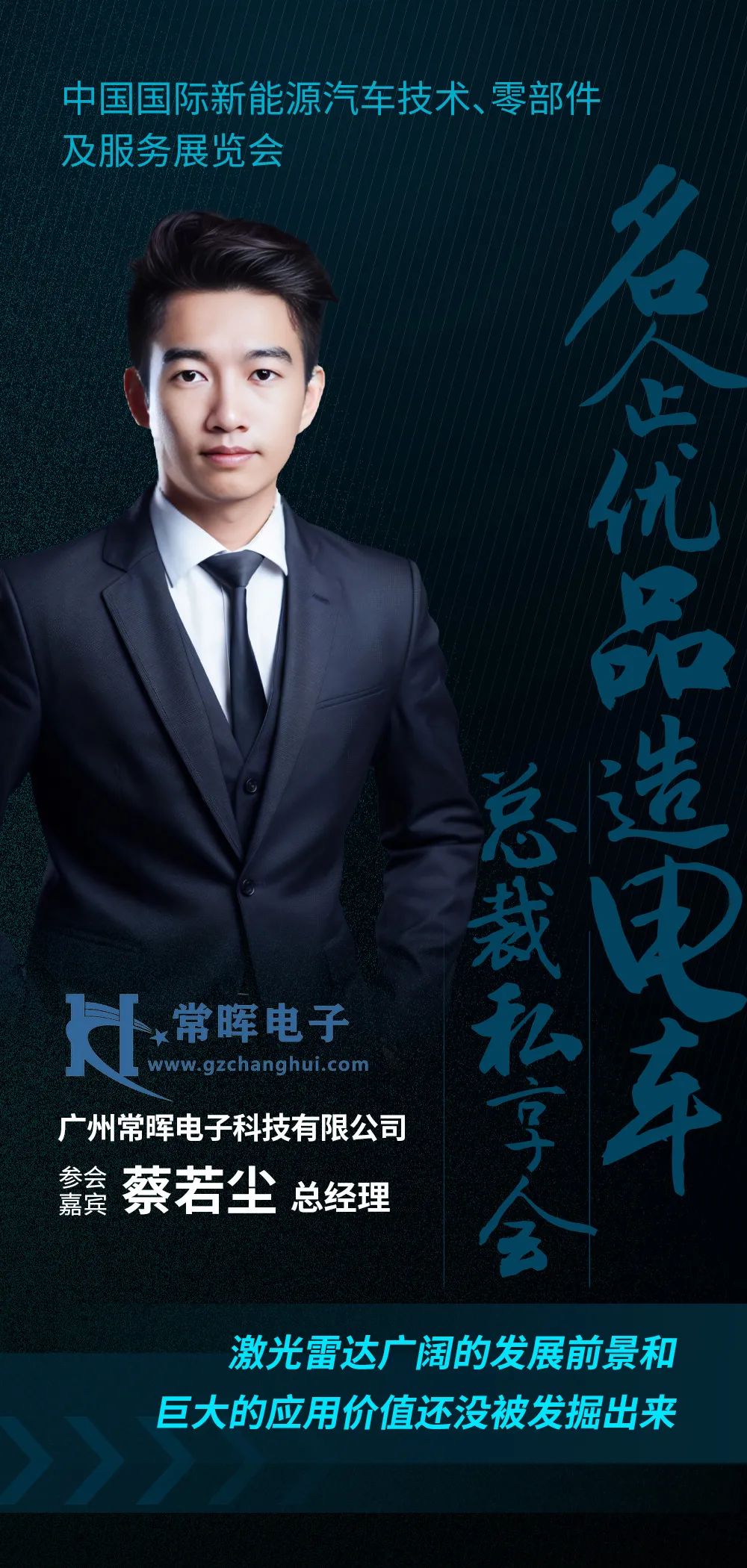 2月28日,广州常晖电子科技有限公司总经理蔡若尘将与266家供应链企业、61家车企、17个大使馆参与【名企优品造电车】总裁私享会,共话新能源汽车供应链发展机遇!