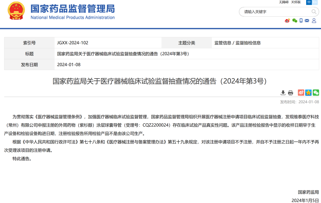 近日,加强医疗器械临床试验监督管理,国家药品监督管理局组织开展医疗器械注册申请项目临床试验监督抽查并发布第3号抽查通告,发现维泰医疗科技(常州)有限公司申报注册的外周药物(紫杉醇)涂层球囊导管(受理号:CQZ2200024)存在临床试验产品真实性问题。该产品注册检验报告中显示的收样日期早于生产设备和检验设备购进日期,注册检验报告所用检验产品不是由该公司生产。对该注册申请项目不予注册,并自不予注册之日起一年内不予再次受理该项目的注册申请。