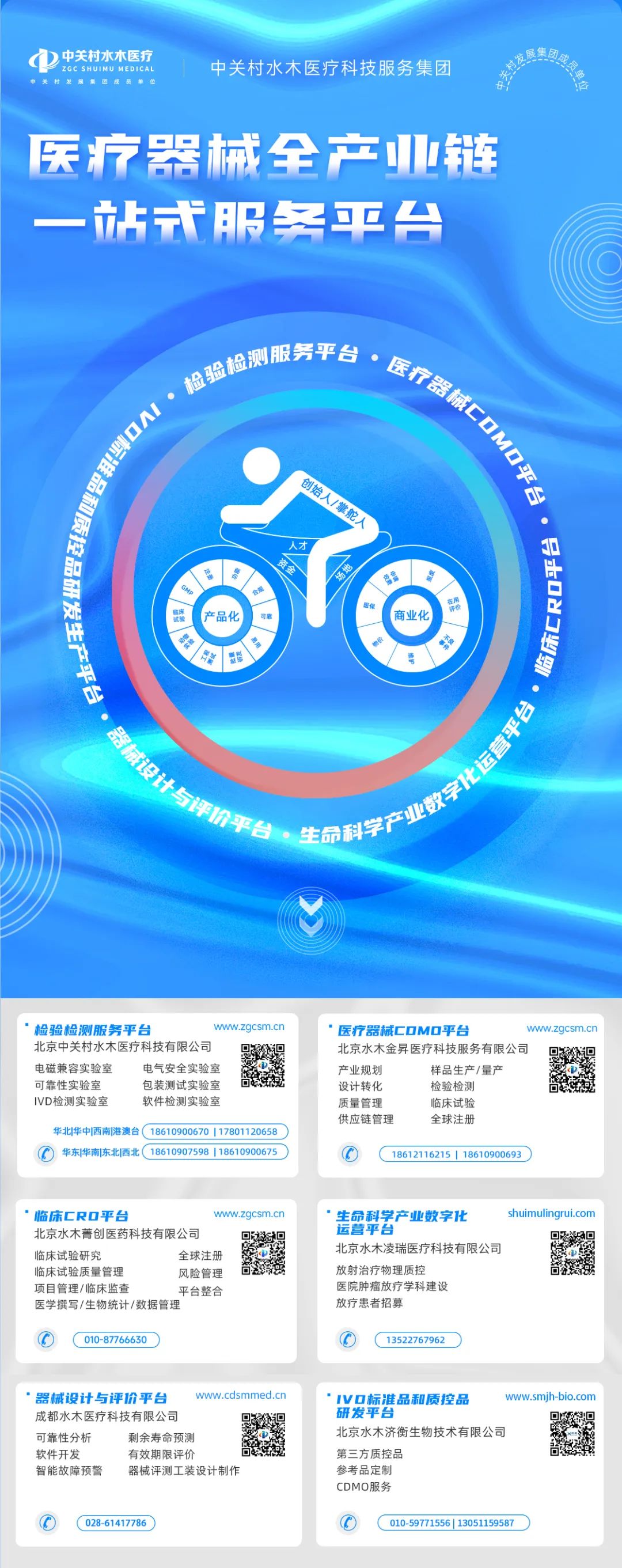 中关村水木医疗科技服务集团成立于2017年,总部位于北京亦庄经济技术开发区。致力于加快推进创新医疗器械产品注册上市进程,解决创新医疗器械企业产业化“最后一公里”的难题。依托集团下设的北京中关村水木医疗科技有限公司、北京水木菁创医药科技有限公司、北京水木济衡生物技术有限公司、成都水木医疗科技有限公司、北京水木凌瑞医疗科技有限公司以及北京水木金昇医疗科技服务有限公司,为医疗器械产品全生命周期的不同阶段提供“端到端”式的一体化创新服务。