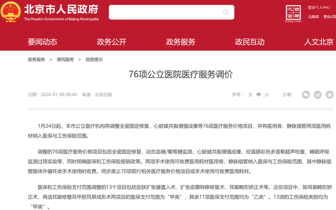 近日,北京市医保局发布通知,自1月24日起,北京公立医疗机构将调整全瓷固定修复、动态血糖/葡萄糖监测等76项医疗服务价格项目,并将医用骨、静脉插管两项医用耗材纳入医保与工伤保险范围,同时调整皮肤扩张器置入术、耳廓畸形矫正术等13个项目的医保和工伤保险支付范围。调整的76项医疗服务价格项目包括全瓷固定修复、动态血糖/葡萄糖监测、心脏磁共振增强成像、经直肠彩色多普勒超声检查、睡眠呼吸监测过筛实验等,同时明确医保和工伤保险报销政策。同步废止70项现行相关医疗服务价格项目或手术使用可收费医用耗材。