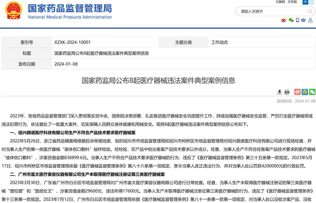 国家药监局公布8起医疗器械违法案件典型案例信息