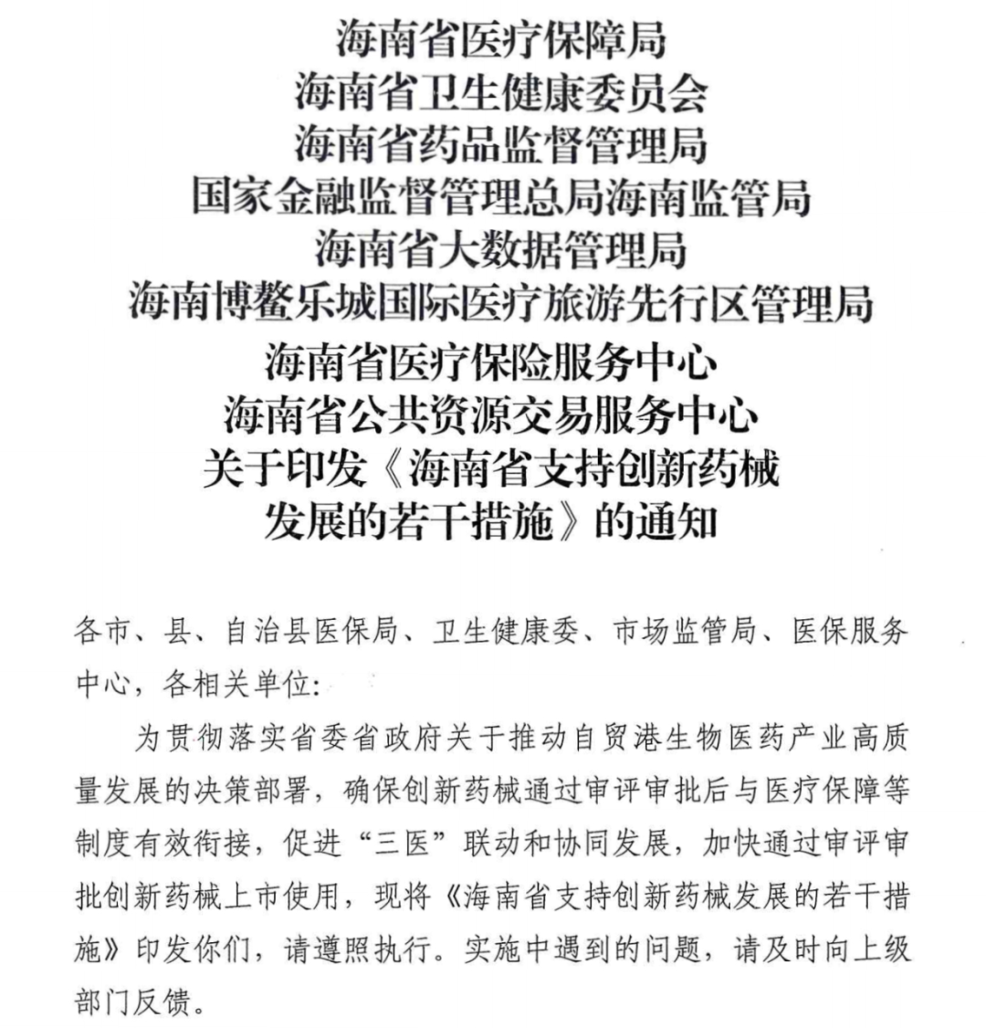 近日,海南省医疗保障局、海南省卫生健康委、海南省药品监督管理局等八部门联合印发了《海南省支持创新药械发展的若干措施》,提出24条措施确保创新药械通过审评审批后与医疗保障等制度有效衔接,促进“三医”联动和协同发展,加快通过审评审批创新药械上市使用。《措施》还提出,建立新批准创新药械进入市场的首发价格形成机制。同时优化新增医疗服务价格项目试行期医疗机构自主定价机制,备案后即可收费。支持和鼓励患者使用创新药械,用支付创新推动产业创新。对符合条件的创新药械,挂网申请5个工作日内完成,对优化重大疾病诊疗方案或填补诊疗空白的重大创新项目开辟绿色通道,在接到申请后10个工作日内完成审核并向国家医保局报告。
