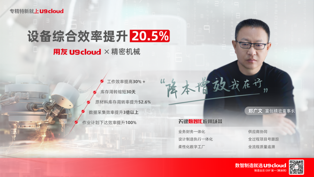 随着智能制造、工业物联网的推进,富创精密以用友U9 cloud为核心,构建了统一、柔性、可扩展的企业数字化管理平台。不但完善了多品种、小批量、定制化产品的离散制造管理模式,建成了集成电路关键设备零部件柔性数字化车间,而且通过与智能制造深度绑定,满足了客户的定制化需求,降低了对人工的依赖。