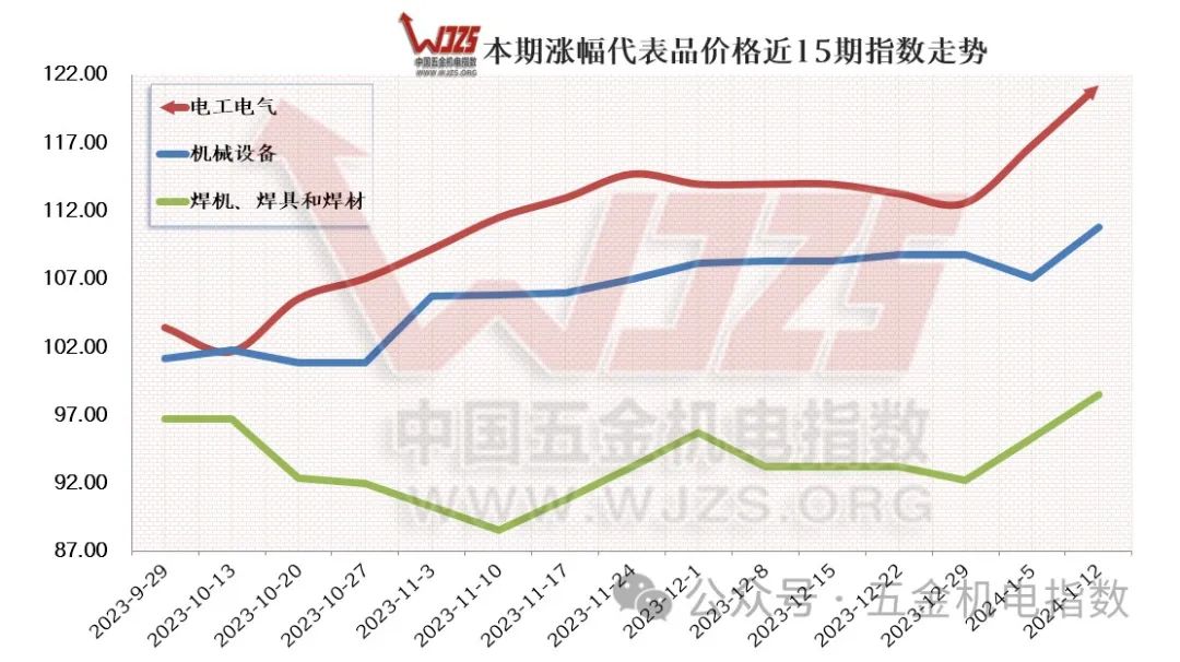 本期组成“中国•成都五金机电价格总指数”的12大类价格指数呈现“8涨3跌1平”的态势。本期涨幅前三类产品是,是:【电工电气】类本期指数121.21,上涨4.41个百分点,【机械设备】类本期指数110.79,上涨3.72个百分点,【焊机、焊具和焊材】类本期指数98.50,上涨3.24个百分点;本期下跌指数前三类产品,分别是【机电设备】类本期指数110.89,下跌1.46个百分点,【五金工具】类本期指数113.80,下跌0.67个百分点,【照明用具】类本期指数93.38点,下跌0.02个百分点。
