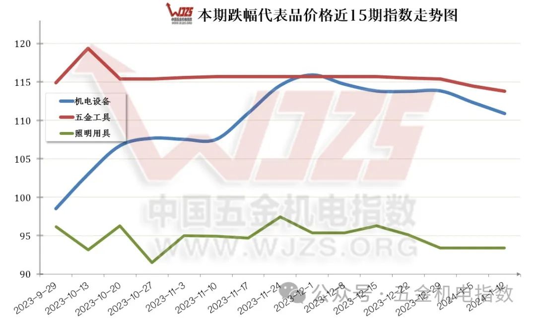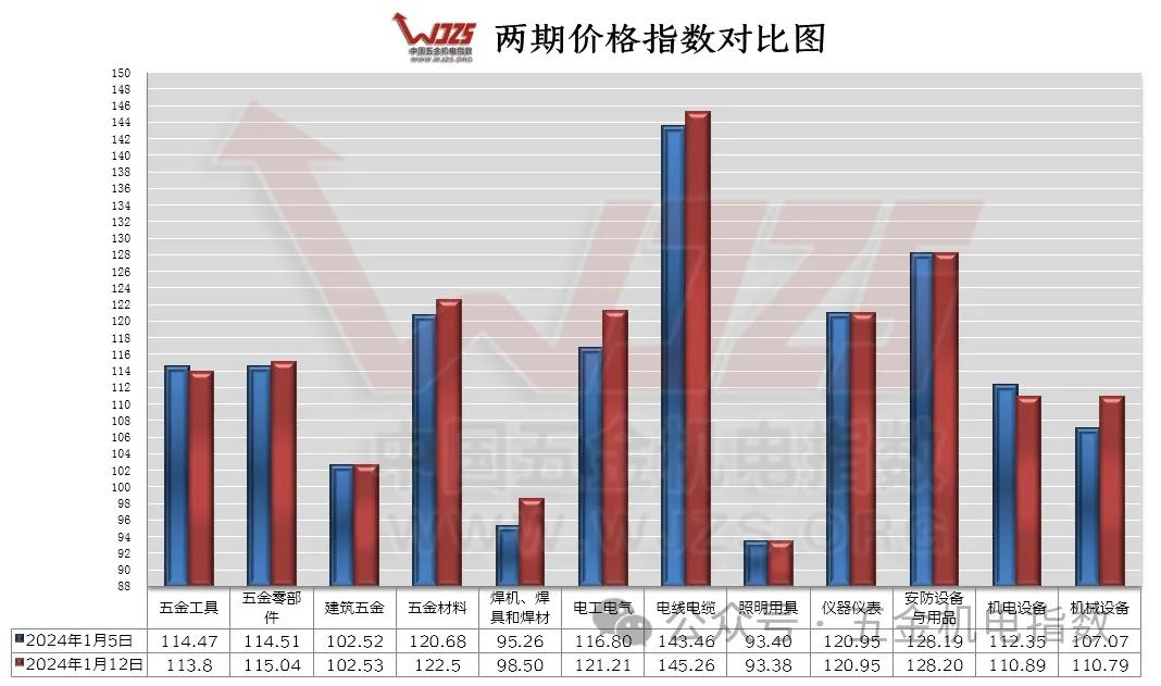 价格总指数走势:本期(2024/01/12)“中国•成都五金机电指数”(以下简称“五金机电指数”)价格总指数收于115.25点与上期相比上涨1.11个百分点,与去年同期108.43相比上涨6.82个百分点。去年12月,全国工业生产者出厂价格同比下降2.7%,与前月相比降幅收窄0.3个百分点;环比下降0.3%,与11月持平。2023年全年,工业生产者出厂价格比上年下降3.0%。从同比看,12月PPI降幅比11月收窄0.3个百分点。其中,生产资料价格下降3.3%,降幅收窄0.1个百分点;生活资料价格下降1.2%,降幅与11月相同。在主要行业中,非金属矿物制品业、黑色金属冶炼和压延加工业价格分别下降7.9%、1.9%,降幅分别收窄0.3、0.4个百分点;化学原料和化学制品制造业、石油煤炭及其他燃料加工业、石油和天然气开采业价格降幅在1.6%到6.3%之间,均有收窄。而从环比看,2023年12月PPI下降0.3%,降幅与11月相同。全年来看,2023年PPI同比下跌3.0%,明显弱于去年的上涨4.1%。这主要源于国际原油价格下跌向国内传导,以及房地产投资下滑,带动国内主导的钢铁、煤炭、水泥等大宗商品价格出现较大幅度下跌。