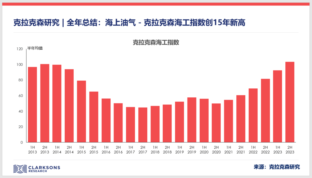 过去一年中,海工油气市场继续增强,Clarksons海工指数在2023年进一步上升了27%,达到多年来的106点的高点。该指数在2017年为45点,在2008年为114点,在2013年为101点,创15年来新高。Clarksons认为该指数将在2024年达到历史最高点。