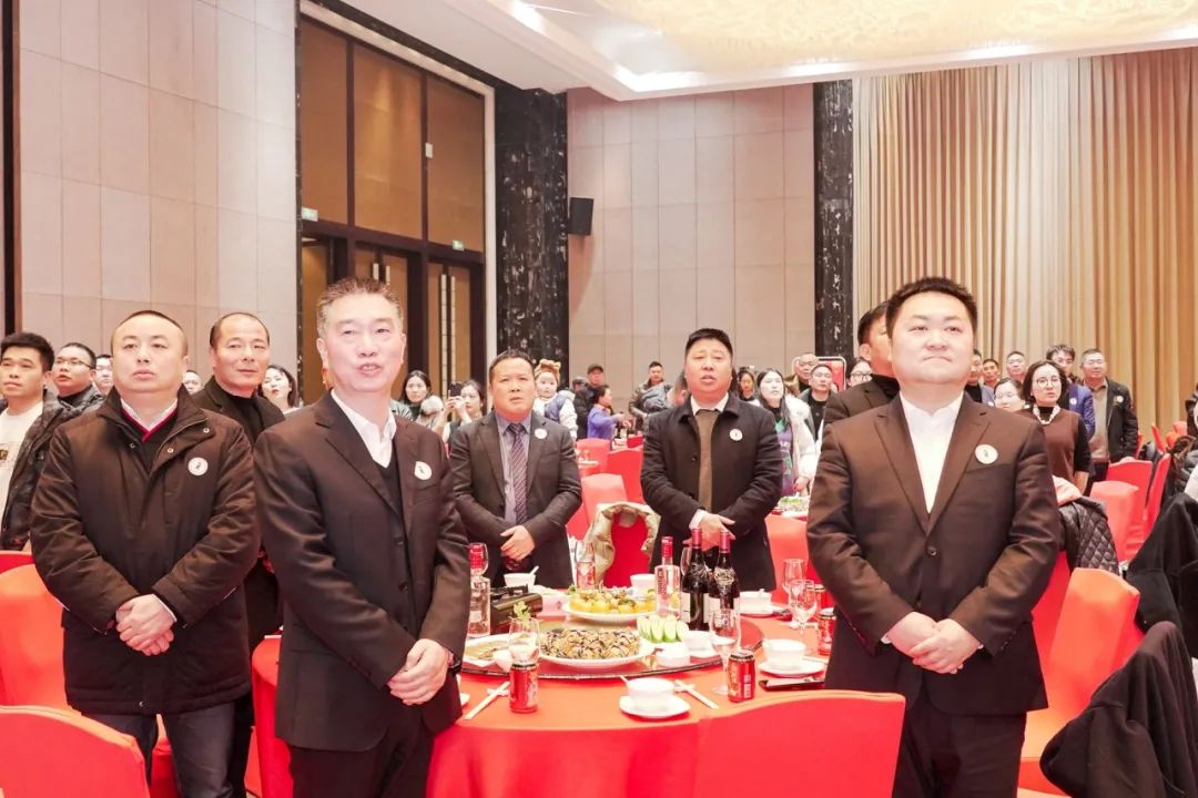 全体起立,奏唱中华人民共和国国歌,十五周年庆典暨2024新春年会在庄严的国歌声中拉开帷幕。