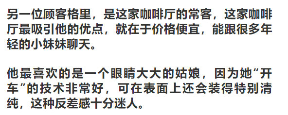 在某张桌子上,有位顾客甚至同时叫了两个女孩聊天,至于聊天的内容,大家都想得到。