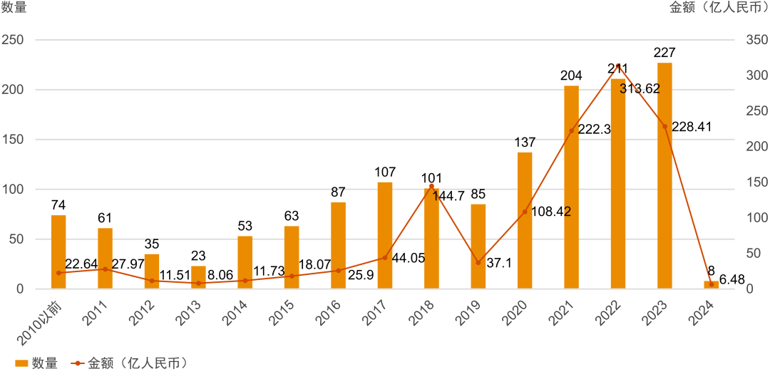 IT桔子数据显示,至截稿日2024年1月9日,中国先进制造领域各子行业累计融资金额,新材料排名第三。2021年至2023年的投资数量和金额占累计投资数量和金额的比例分别为43%和62%,新材料产业的投资热度持续上涨。2023年新材料产业共发生227起投资事件,总金额达228.41亿元;进入到2024年,仅1月9日前就新发生8起投资,涉及的新材料领域分别为高端等静压材料、电子级硅烷及碳纤维材料等。