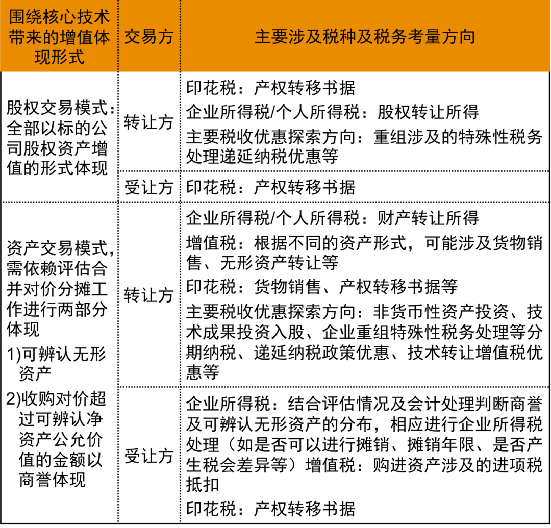 考虑到新材料产业具有技术密集性高、研发投入高、产品附加值高、国际性强、应用范围广的特征,并购重组中往往伴随核心技术所带来较高的增值,并购整合的模式也会呈现多样化的状态,并涉及一系列复杂的税务问题。其中围绕并购整合中核心技术,交易双方需充分考虑以下两个维度:1)选择不同并购交易模式下核心技术的税务影响;2)标的业务/企业在运营过程中与核心技术相关的税收优惠的适用性与可持续性。