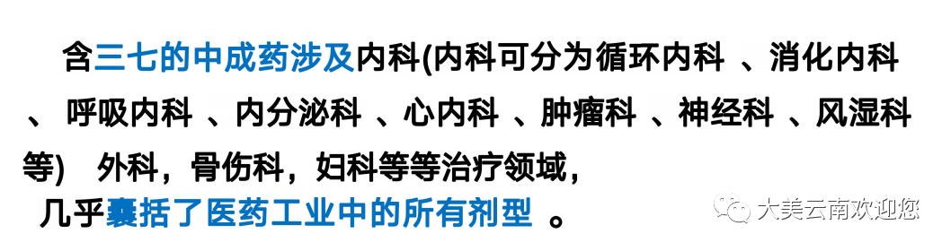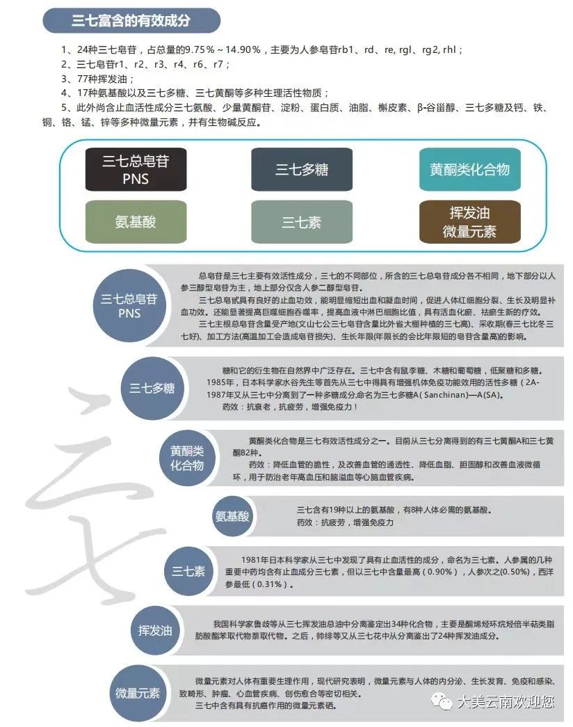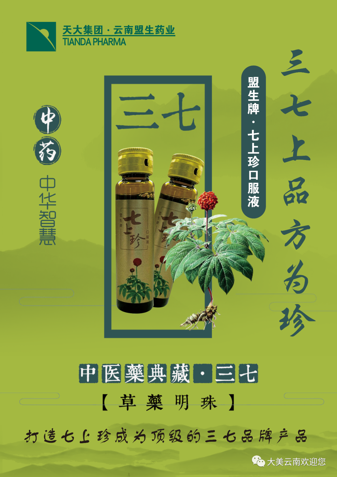 《本草纲目拾遗》中记载:“人参补气第一,三七补血第一,味同而功亦等,故称人参三七,为中药中之最珍贵者。”扬名中外的中成药“云南白药”和“片仔黄”,即以三七为主要原料制成。
