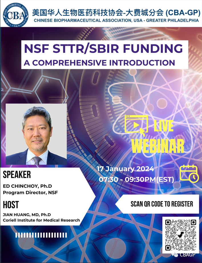 您好!美国华人生物医药科技协会-大费城分会(CBA-GP)诚挚邀请您于1月17日参加即将举行的一场引人瞩目的会议。此次会议的主题是“小型科创企业如何申请美国国家科学基金的项目基金”,届时我们将有幸邀请到美国国家科学基金会(NSF)的SBIR/STTR项目总监Ed Chinchoy博士担任主讲人。本次会议将在线上举行,热烈欢迎业界同仁参与交流讨论。