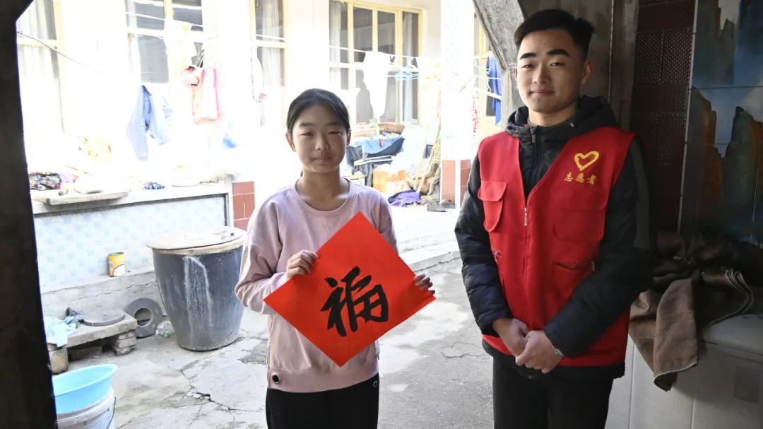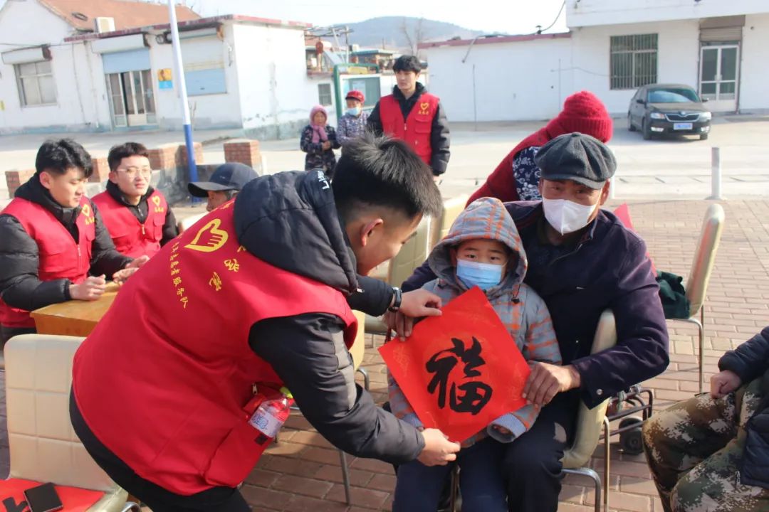 活动现场,同学们的书法即席挥毫,红纸彤彤,墨香阵阵,蘸墨、压纸、牵联,挥毫绘就,行云流水。一副副飘满墨香的春联、遒劲有力的“福”字跃然纸上。书写的福字和春联不仅为现场村民送上祝福,也为不方便出行的村民送福到家。