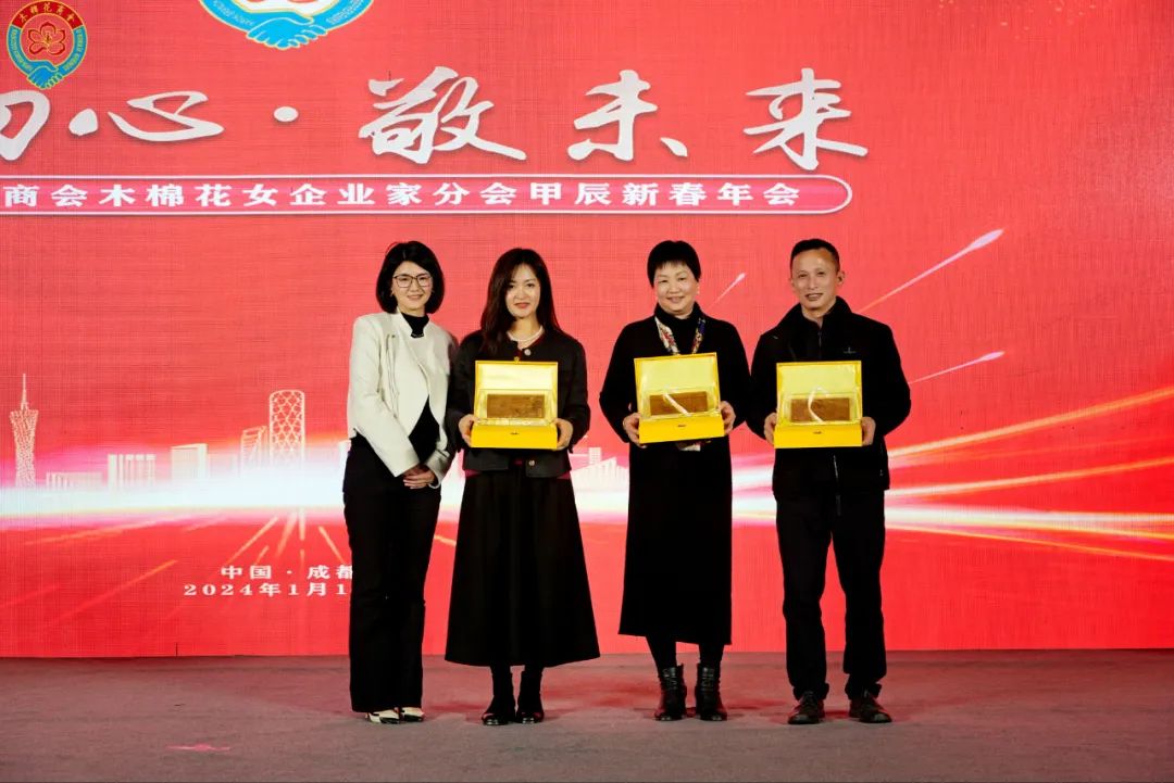 云南怒江军分区原司令员庄宏华赠予木棉花女企业家分会戴燕娟会长一幅书画作品以及代表王宋达主席为木棉花商会创作的一首诗——《贺四川木棉花商会甲辰新春年会》赠送给商会。