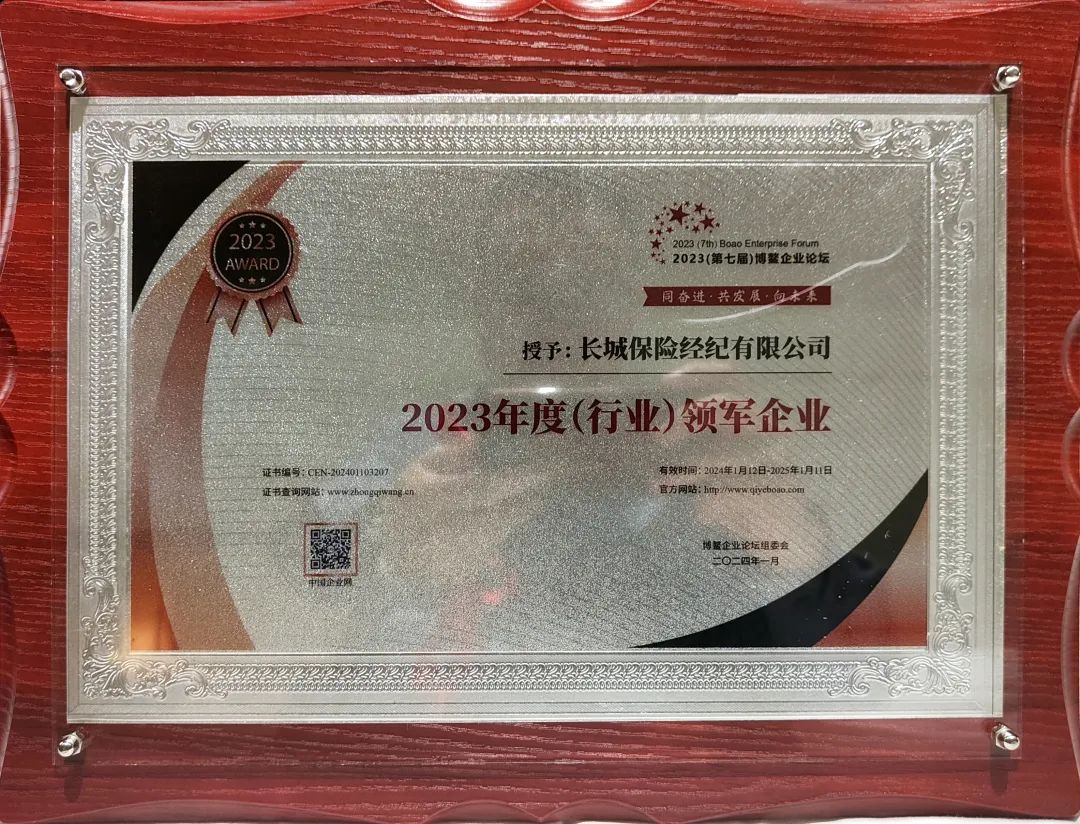 长城保险经纪有限公司荣获“2023年度(行业)领军企业”称号