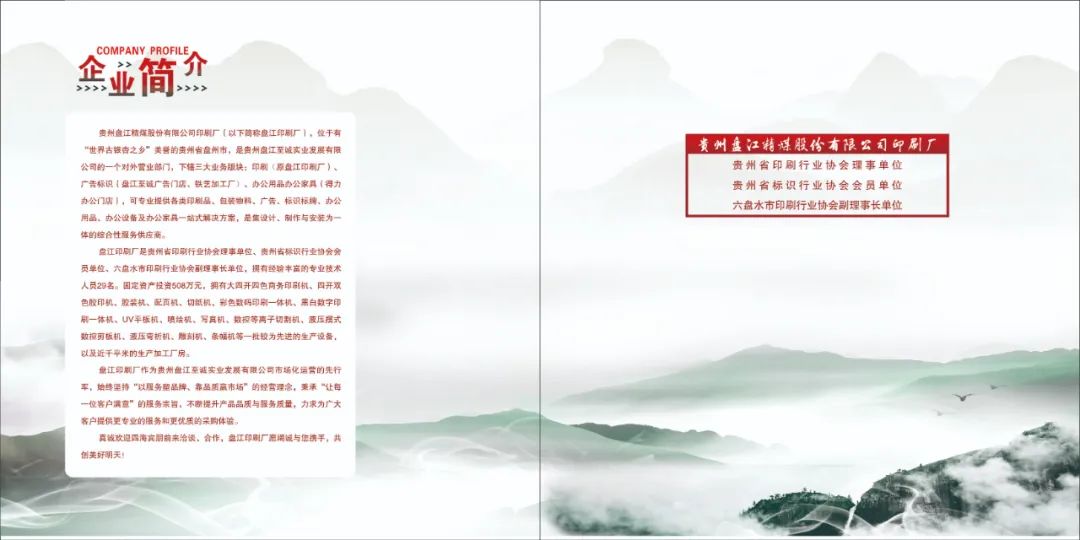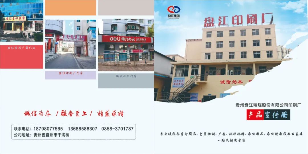 贵州盘江精煤股份有限公司印刷厂 ( 以下简称盘江印刷厂),位于有“世界古银杏之乡”美誉的贵州省盘州市,是贵州盘江至诚实业发展有限公司的一个对外营业部门,下辖三大业务版块: 印刷(原盘江印刷厂)广告标识( 盘江至诚广告门店、铁艺加工厂) 、办公用品办公家具 ( 得力办公门店),可专业提供各类印刷品、包装物料、广告、标识标牌、办公用品、办公设备及办公家具一站式解决方案,是集设计、制作与安装为一体的综合性服务供应商。