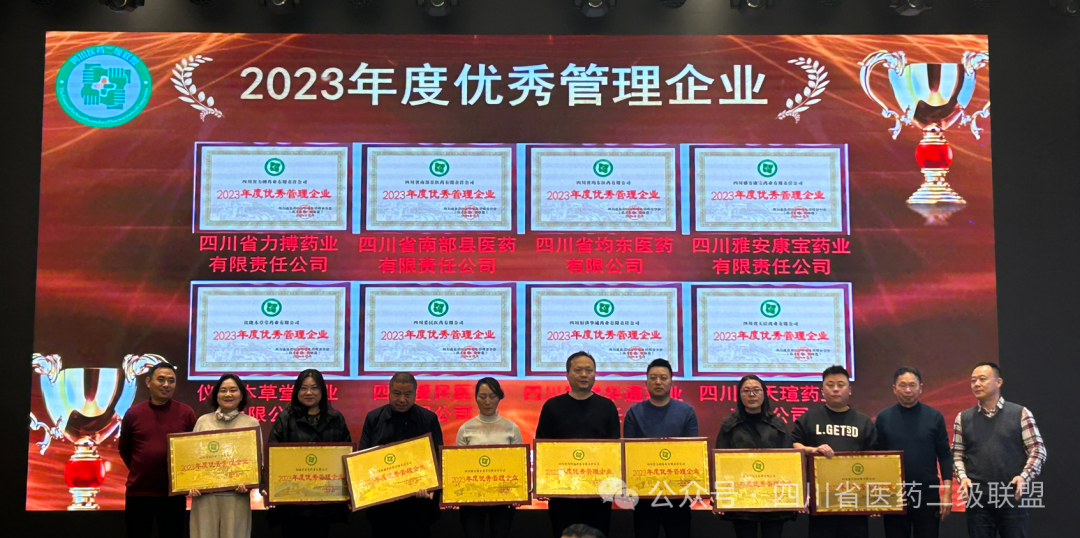 3、2023年度优秀管理企业:四川省力搏药业有限责任公司、四川省南部县医药有限责任公司、四川省均东医药有限公司、四川雅安康宝药业有限责任公司、仪陇本草堂药业有限公司、四川爱民医药有限公司、四川射洪华通药业有限责任公司、四川省天瑄药业有限公司。
