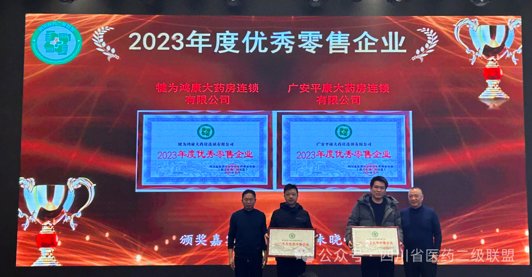 2、2023年度优秀零售企业:广安平康大药房连锁有限公司、犍为鸿康大药房连锁有限公司。