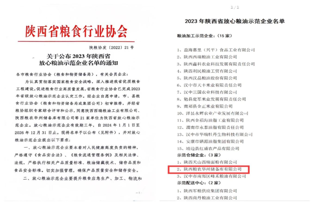 年陕西省放心粮油示范企业名单的通知》中,华州库公司榜上有名,被授予