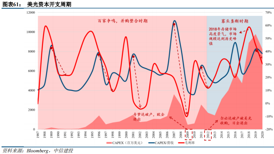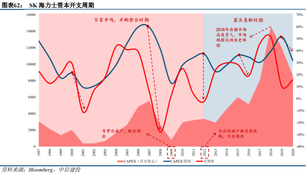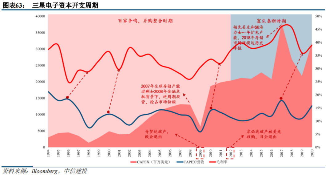 存储芯片具有大宗商品的属性,供需错配导致价格周期性波动。存储芯片下游需求量大,需要通过规模扩张才能维持经济效益,同时产品多为标准化产品,因此具有大宗商品的属性。当行业需求旺盛,处于上行周期时,需求端的增长导致短期供不应求,产品价格持续上扬(即上涨基本为需求导向型),此时当一家存储厂商选择扩产以扩大市场份额时,通常其他厂商也会跟随扩产,导致产能集中落地,从而造成产能过剩,最终引发存储芯片价格下跌(即下跌基本为供给导向型),由此形成一定的周期性。DRAM 和 NAND 行业已形成垄断格局,DRAM 尤为明显,因此各家扩产与定价策略类似,资本支出的开出较为集中,使得存储芯片的周期性显著强于其他半导体品类。(存储器市场价格周期主要与产能周期有关,库存周期表现不明显)以美光和 SK 海力士为例,每轮大规模资本支出后的 1-3 年内,产品进入降价周期,毛利率下降。