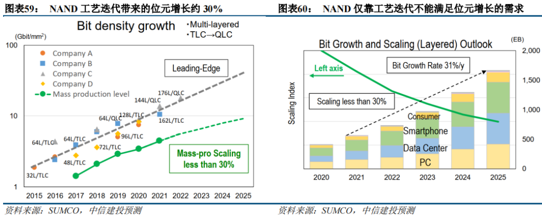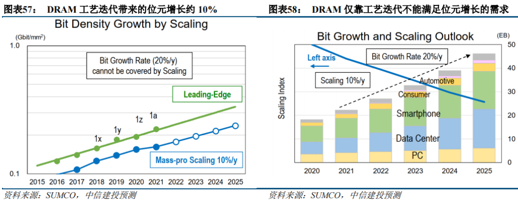 往 2023 年以后看,暂无确定的新增产能落地。往 2023 年以后看,三星电子暂无扩产计划;美光计划在日本广岛投资约 70 亿美元扩产 DRAM,新工厂将于 2024 年开始投入运营;SK 海力士将在未来十年于韩国首尔投资 1060 亿美元用于扩产 DRAM,新工厂于 21Q4 动工,将于 2025 年完成所有工程项目,之后启动量产。从各厂商的扩产规划看,目前 2023 年及以后存储芯片确定的新增产能较少。工艺迭代难以完全满足位元增长需求,预计 2023 年以后存储产能增长达到 5~10%。根据 SUMCO 预测,2021-2025 年 DRAM 位元需求复合增速达 20%,其中 10%的增速可由 DRAM 工艺迭代满足,剩余不足 10%的增速仍需凭借产能扩张(即 DRAM 晶圆供给的复合增速仍需达到 10%)。而 2021-2025 年 3D NAND 位元需求复合增速达 31%,其中 30%的增速可由 3D NAND 工艺迭代满足,由于近两年 3D NAND 位元供给增长较多,预计 2021-2023 年 3D NAND 所需晶圆的供给增速为 1%(当前扩产速度超过所需,因此导致供给过剩),2023-2025 年恢复至 8%的复合增速。因此,我们预计 2023 年以后 DRAM 和 3D NAND 产能增长仍可达到 5~10%。