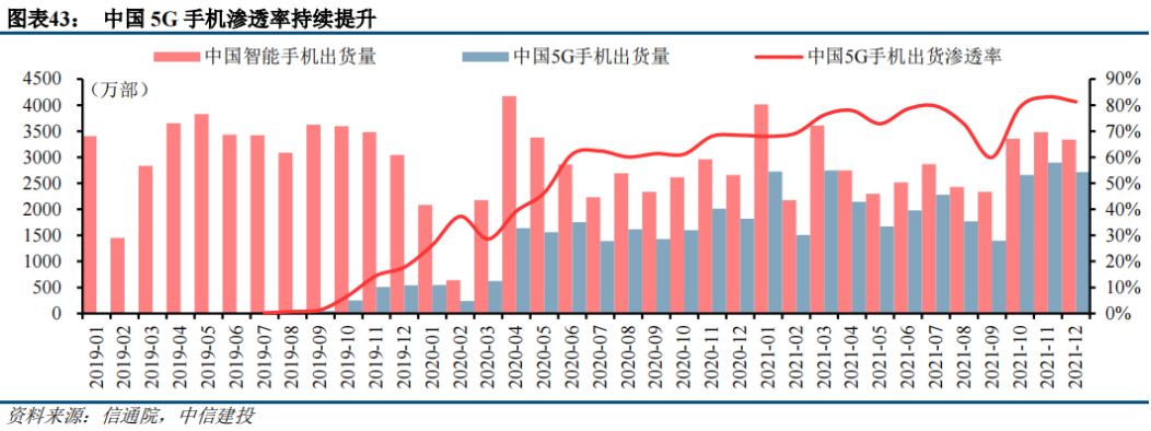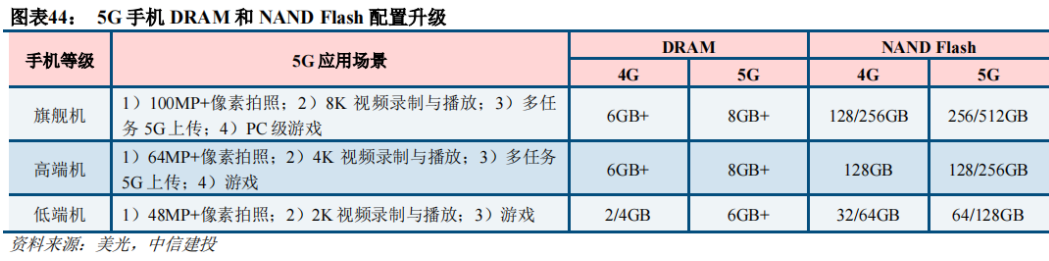 预计 2025 年全球 5G 渗透率接近 70%,5G 换机拉动存储容量提升。随着全球更多地区开始 5G 商用部署、各品牌陆续推出 5G 机型,5G 智能手机渗透快速提升。根据 IDC 预测,2021 年 5G 智能手机出货量将占全球销量的 40%以上,并将在 2025 年增长至 69%。国内 5G 渗透率全球领先,2021 年 12 月已达81%。5G 手机升级带来存储容量升级,根据美光,高清视频、高像素拍摄、5G 传输和云游戏需求不断增长,智能手机从 4G 切换至 5G,旗舰机 DRAM 配置将从 6GB+提升至 8GB+,NAND 配置将从128/256GB 提升至 256/512GB,智能手机单机存储芯片搭载容量持续提升。