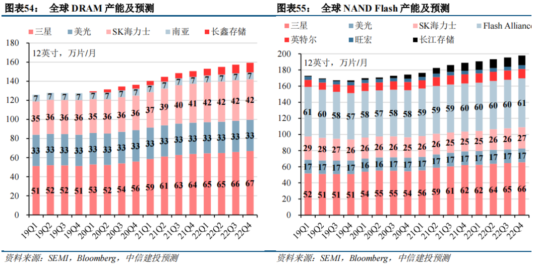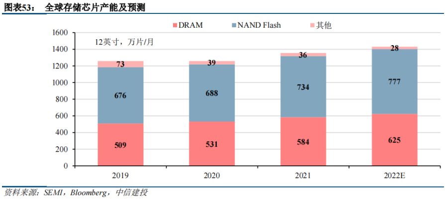 存储芯片位元(bit)供给增长来自两方面:①工艺制程迭代带来单片晶圆中位元增长。②晶圆产能的扩张。龙头厂商将主要精力投向制程迭代,以满足高速增长的位元(GB)需求。DRAM 方面,根据 SK 海力士预计,DRAM 工艺制程从 1Znm 到 1αnm,单片晶圆可切出的晶粒数量增长 25%,在晶圆产能不增长的情况下,仍将驱动 DRAM 位元供给增长。目前,三星电子、美光、SK 海力士等 DRAM 产品生产正在引入 EUV 光刻,工艺制程正在从 1Znm 往 1αnm 转换,以满足 DRAM 位元增长的需求。NAND 方面,3D堆叠工艺持续演进,176 层渐渐成为 3D NAND 主流,目前头部厂商正在推进 2XX 层 3D NAND 的研发和量产,预计显著提升单片晶圆的位元产出量。2021-2022 年 DRAM 和 NAND Flash 产能稳定增长。我们统计了 DRAM 和 NAND Flash 主要厂商的产能及预测,DRAM 厂商选取三星电子、美光、SK 海力士、南亚科技、长鑫存储等 5 家,NAND Flash 厂商选取三星电子、美光、SK 海力士、Flash Alliance(东芝+西部数据)、英特尔、旺宏、长江存储等 7家。整体来看,2020 年、2021 年、2022 年 DRAM 产能分别同比增长 4.5%、9.9%、7.0%至 531、584、625 万片/年,NAND Flash 产能分别同比增长 1.7%、6.7%、5.9%至 688、734、777 万片/年,加上部分无法归属于 DRAM 或 NAND Flash 以及 NOR Flash、SRAM 等小类存储的产能,2020 年、2021 年、2022 年存储芯片整体产能分别同比增长 0.0%、7.6%、5.6%至 1258、1354、1429 万片/年,产能稳定增长。