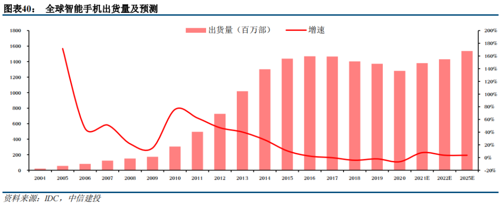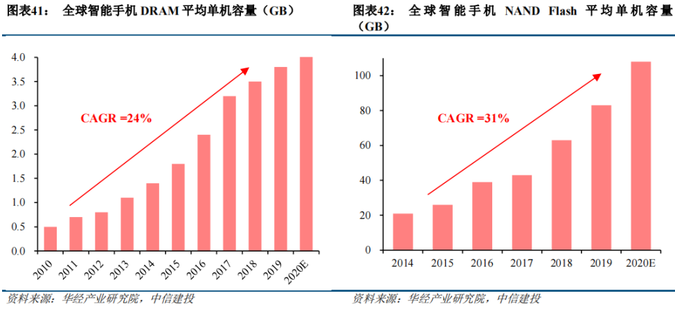 智能手机进入存量升级时代,存储芯片单机搭载容量维持高增长。智能手机经历过2008-2016 年的爆发式增长,出货量于 2016 年达到峰值,近年来出货量有所下降。随着 5G 换机的推进,智能手机出货量有望恢复小幅增长,整体智能手机市场属于存量市场。其搭载的 DRAM 平均单机容量从 2010 年的0.5GB 增长至 2020 年 4.3GB,复合增速达 24%,NAND Flash 平均单机容量从 2014 年的 21GB 增长至2020 年的 108GB,复合增速达 31%。