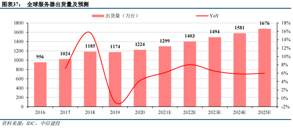 服务器出货量稳健增长。根据 IDC 统计,2016-2020 年,由于云计算浪潮、AI、企业数字化转型、物联网等的推动,全球服务器出货量从 956 万台增长至 1224 万台,复合增速达 6.4%。
