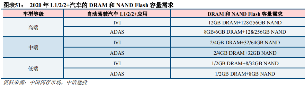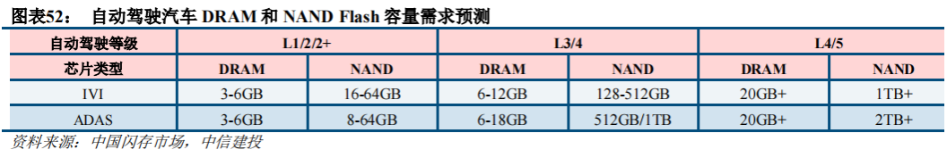目前汽车存储容量与智能手机相当。当前汽车对储存的需求主要来源于 ADAS 系统和 IVI 系统,其中 ADAS 占比超过 10%,IVI 约占 80%。根据中国闪存市场,目前高端车型至多搭载 12GB DRAM 和256GB NAND,与当前旗舰智能手机相当;而在中端车型中,2~4GB DRAM 和 32~64GB NAND Flash 则为常见配置;在低端车型中,DRAM 和 NAND Flash 容量需求更低,仅为 1~2GB 和 8~32GB。