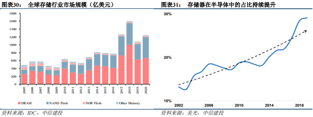 存储芯片市场规模维持长期增长,在半导体市场的占比波动上行。全球存储芯片市场于波动中保持上升趋势,市场规模从 2005 年的 546 亿美元增至 2020 年的 1229 亿美元,复合增速达 5.6%,IC Insights 预计 2023 年将超过 2000 亿美元。存储芯片在整个半导体中的占比 2002 年在 10%出头,到上一轮景气度高点 2018 年,达到 33.1%,整体处于波动上行的状态。2019 年和 2020 年,由于存储器周期下行,该比例有所下降,根据 WSTS,2020 年该比例约为 27%。
