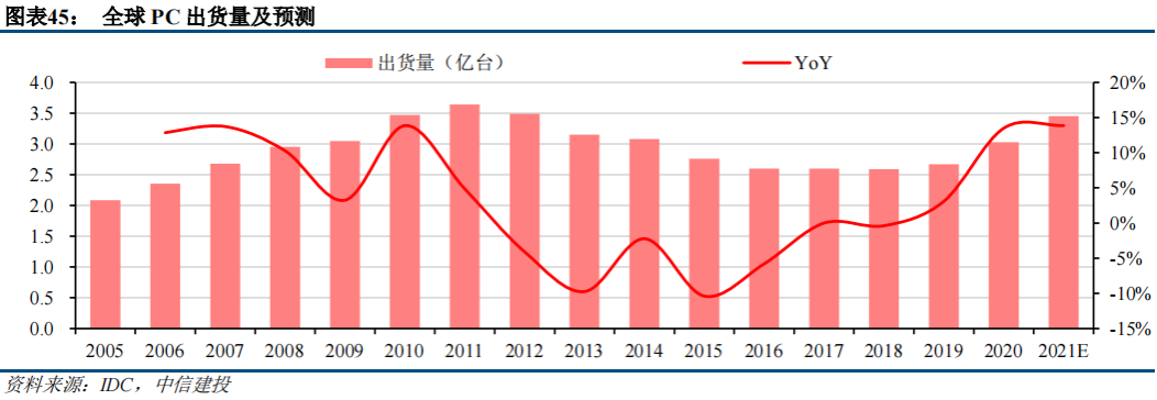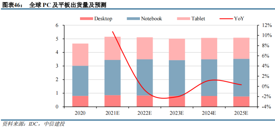 2021 年全球 PC 出货量接近历史峰值水平,未来出货量将维持稳定。在疫情远程办公和教育的推动下,2020 年全球 PC 市场扭转颓势,同比增长 13.5%。疫情并非长期性事件,PC 需求量持续高速增长存在较大不确定性。IDC 预计 2021 年全球 PC 出货量至 3.45 亿台,同比增长 13.5%,接近 2011 年的历史峰值,预计出货量到 2025 年维持在 3.5 亿台水平。若考虑进平板电脑,则 2021 年全球 PC+平板出货量达 5.2 亿台,至 2025 年小幅下降至 5.1 亿台。因此,从出货量看,未来 PC+平板为存量市场,其存储芯片需求主要来自单机搭载容量的提升。