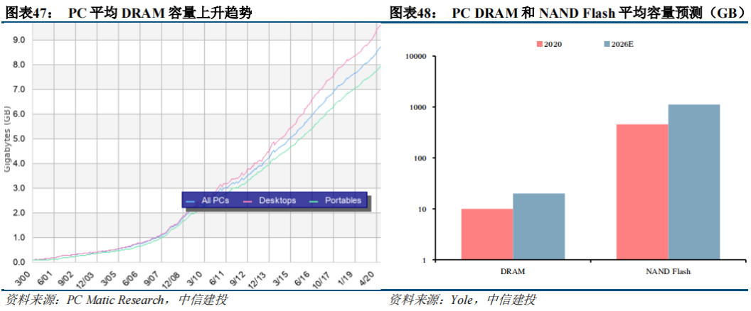 未来 PC DRAM 和 NAND Flash 平均容量将保持高速增长。随着数据存储需求的不断增长,PC 存储配置逐年升级,根据 PC Matic Research,PC DRAM 容量自 2000 年以来持续增长,到 2020 年单机接近10GB,NAND Flash 容量变化趋势与之类似。根据 Yole 预测,2020 年 PC 平均 DRAM 容量约为 10GB,2026 年 PC 平均 DRAM 容量将近 18GB,复合增速约为 10%。而 2020 年 PC 平均 NAND Flash 搭载量约为 450GB,2026 年 PC 平均 NAND Flash 搭载量将高于 1000GB,复合增速约为 15%。