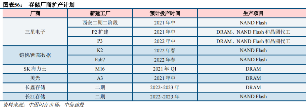 存储新增产能投放集中在 2021-2022 年。分厂商看,三星电子的西安二期扩产,主要为 NAND Flash,于 2021 年中投产,而平泽 P2 和 P3 的新增产能(DRAM、NAND Flash 及晶圆代工)分别于 2021 年中和 2022 年投产。铠侠/西部数据的 K2 和 Fab7 产能(NAND Flash)将于 2022 年春投产。SK 海力士和美光的 DRAM 扩产则分别于 2021 年 Q1 和年中投产,而国内的长鑫存储和长江存储近两年及未来两年持续有产能开出,但爬坡需要一定的时间,实际产能相较于全球产能影响有限。整体来看,存储大厂新增产能释放主要在 2021-2022 年,2021 年产能投放较多,预计 2022 年仍有产能投放,但增速放缓。