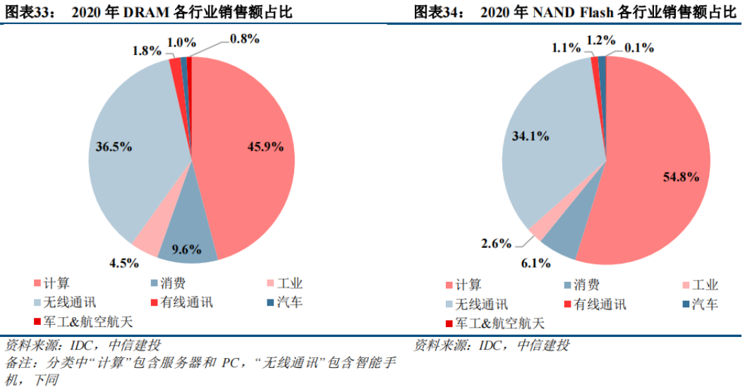 从结构上看,DRAM 和 NAND Flash 为存储芯片的核心品类。受到 5G 手机、服务器、PC 等下游需求驱动,存储芯片市场规模将快速扩张。2020 年 DRAM 下游市场中,计算、无线通讯、消费和工业分别占 45.9%、36.5%、9.6%、4.5%,而 NAND Flash 下游市场中,计算、无线通讯、消费和工业分别占 54.8%、34.1%、6.1%、2.6%(注:IDC 的分类中,“计算”包含服务器和 PC,“无线通讯”包含智能手机)。智能手机 5G 升级,带动智能手机单机容量提升,云计算和 AI 发展,推动存储需求不断上行。另外,远程服务的诸多应用持续带动服务器需求,而平板、笔记本电脑等也因远程办公、教学需求,出货量大幅增长。下游市场发展将带动 DRAM 和 NAND Flash 快速发展。