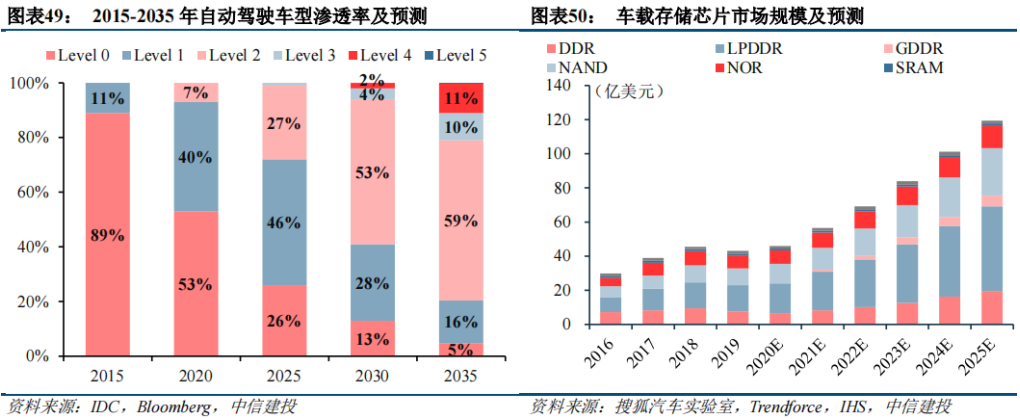 汽车自动驾驶等级提升,大容量数据存储需求增长。自动驾驶汽车可以减少人为干预对于驾驶的必要性, 英飞凌预计 2020 年 L1 及以上新车渗透率接近 50%,L2 渗透率达 7%,未来将从目前的 L2 阶段发展至完全不需要驾驶员干预的 L4 及 L5 阶段。随着自动驾驶等级的提升,以及车载信息娱乐系统(IVI)、多摄像头视觉处理、长寿命电池和超高速 5G 网络的引入,车内车外数据流量大大提升,超大计算处理成为必需品,相应地大容量数据缓存(DRAM、SRAM)、存储(NAND)和其他存储(NOR Flash、EEPROM 等)需求大幅增长。汽车智能化驱动数据存储需求,车载存储市场有望提速增长。2020 年全球车载存储市场规模约 46 亿美元,在整体存储市场占比不足 5%,但成长速度较高,2016-2020 年复合增速为 11.4%,预计随着汽车智能化水平的提升,车载存储市场提速增长,主要体现在 DRAM(尤其是新能源车用的 LPDDR)、NAND 等需求高速增长,2025 年车载存储市场将增长至 119.4 亿美元,2021-2025 年复合增速为 21.0%。从结构看,车载存储市场以 DRAM 和 NAND 为主,占比分别为 57%和 23%,其他小类的存储芯片如 NOR Flash、SRAM 和 EPROM/EEPROM 也在车内有广泛应用。