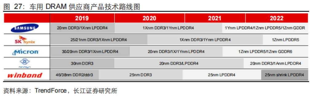 主流 DRAM 产品是指当前市场上被广泛销售的 DDR4-5、LPDDR4-5、GDDR5-6 等产品型号,该市场占据了 DRAM 行业绝大多的市场份额,行业主要玩家为三星、美光、海力士;主流 DRAM 产品大规模应用在 PC、手机、服务器和 GPU 等领域;其行业景气度受供给和需求两端的影响;此外,行业代际之间的演变如从 DDR4 向 DDR5 的渗透也影响着细分产品的价格走向。因此,在研究该市场时,需要持续追踪行业供需变化和产品代际演变的趋势。利基型 DRAM 市场是一个小众(市占率不足一成)、动态的成熟产品市场,现有产品规格主要包括 DDR1-DDR3 全系列内存容量产品以及逐渐转至利基市场的 DDR4-4Gb。除了三大厂有较少一部分产品分布在利基型 DRAM 市场,该行业的主要玩家还包括中国台湾的南亚科技、华邦电子、代工厂力积电以及中国大陆的兆易创新和北京君正。从需求端来看,利基型 DRAM 主要应用于 TV、安防以及消费类电子领域;现阶段由于汽车的智能化程度尚浅,因此对 DRAM 的速度要求不如 PC、手机和服务器,更侧重于DRAM 工作状态的稳定性,因此当前车规级 DRAM 主要使用成熟制程进行生产。由于利基型市场下游应用领域广泛、因此行业需求的周期性波动相对较小,呈现出稳定增长的局面。
