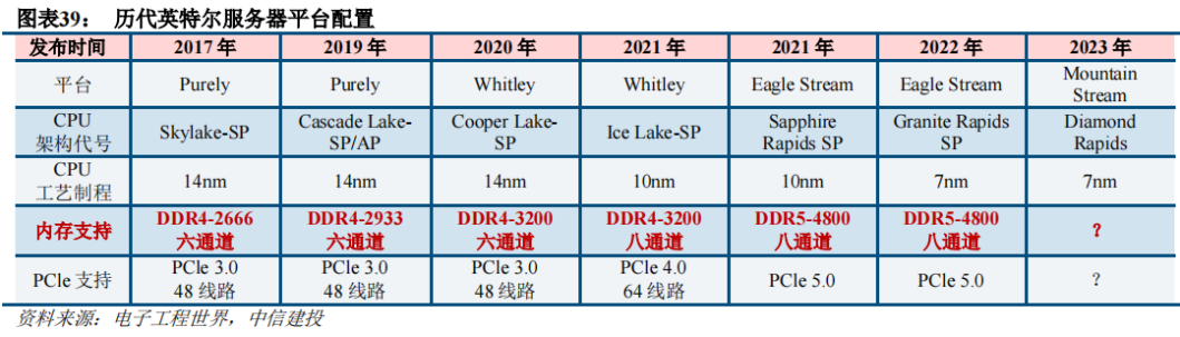 服务器平台升级带来存储芯片容量提升和规格升级。服务器更新换代带来 DRAM 和 NAND Flash 搭载容量的提升,据 DRAMeXchange 测算,服务器的 DRAM 平均单机容量从 2019 年的 304GB 上升至2020 年的 397GB,涨幅达 30%。据 ChinaFlashMarket 测算,服务器的 NAND Flash 平均单机容量从 2019年的 2300GB 增至 2020 年的 2700GB,增幅达 17%。目前,英特尔平台的服务器占市场主导地位,以其为例,其服务器正从 Purely 平台向 Whitley 平台切换,同时下一代 Eagle Stream 平台将于 2022 年起量,服务器平台切换带来 DRAM 和 NAND Flash 搭载量和规格的提升,如内存通道从 6 提升至 8,DRAM 从DDR4 升级至 DDR5。