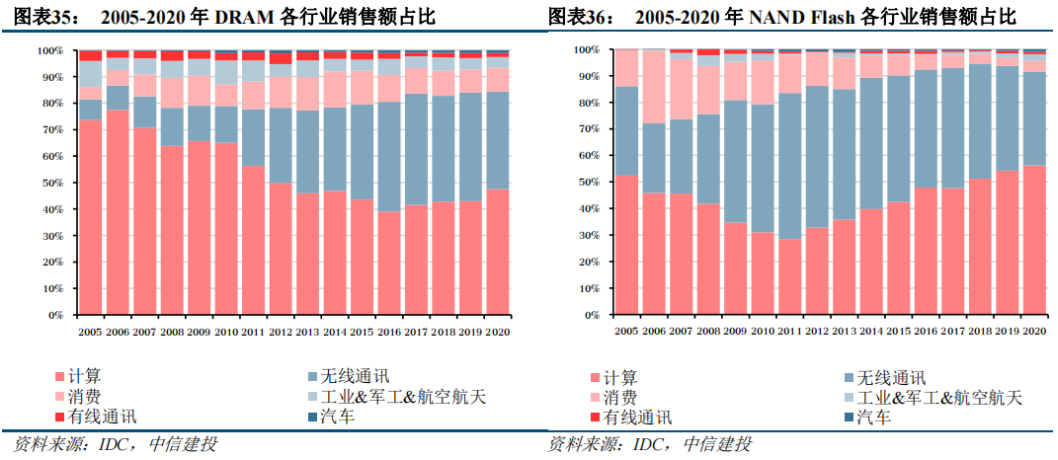 从应用结构变化趋势看,服务器和智能手机成为近 10 年存储需求增长的主要驱动力。①智能手机:2010 年智能手机爆发,对存储芯片的需求随之爆发,DRAM 下游应用中智能手机占比开始快速上升,手机 DRAM 市场规模从 2005 年的 21 亿美元增长至 2020 年的 239 亿美元,复合增速 17.8%,手机 NAND 市场规模从 2005 年的 70 亿美元增长至 2020 年的 189 亿美元,复合增速 6.8%。②计算(服务器及 PC):计算市场稳定增长,计算用 DRAM 销售额持续增长,销售额从 2005 年的 233 亿美元增长至 2020 年的300 亿美元,复合增速 1.7%,增速较低是因为 PC 市场自 2010 年以来有所衰退。而 NAND Flash 下游应用中计算占比开始快速上升,销售额从 2005 年的 84 亿美元增长至 2020 年的 304 亿美元,复合增速 8.9%。
