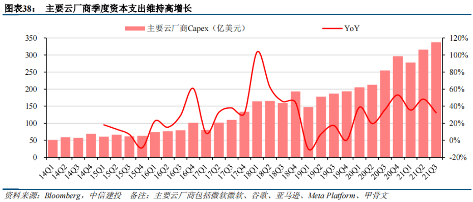 云服务厂商资本开支维持高增速,服务器出货增长动能强劲。在长期驱动力(AI、云计算)的作用下,全球云服务厂商加速采购服务器,20Q1-21Q2 服务器采购经历了先补库存后去库存,21Q3 以来服务器需求恢复。短期来看,服务器需求企稳,而全球云服务厂商的资本支出维持40%上下的高增长,由此判断服务器需求有较强支撑。长期来看,5G、云计算浪潮、AI、企业数字化转型、物联网等快速发展,将促使企业增购服务器。IDC 预计 2021-2025 年维持稳定增长,2021 年出货量达到 1299 万台,到 2025 年达到 1676 万台,复合增速为 6.5%。