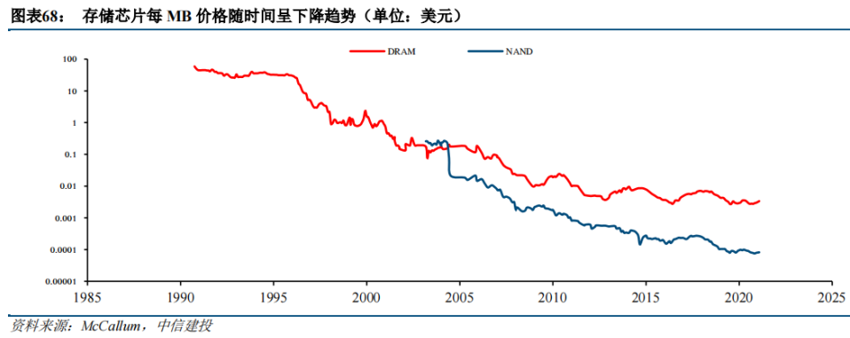 从中短周期来看,受需求与供给的错配导致,DRAM和NAND价格呈现周期波动,每轮周期约 3~4 年。(这也基本符合晶圆厂“投资建设——量产——产能爬坡”的时间周期规律)长周期看,单个位元成本呈现下降趋势。根据三星电子,DRAM 技术演进路径主要为缩小工艺制程,随着工艺制程升级,单位 Gb 成本持续下降。而 NAND Flash 2013 年前技术演进路径为工艺制程,随着工艺制程升级,单位 Gb 成本持续下降,2014 年随着 3D NAND 量产,堆叠层数从 32 层持续增长至当前的192 层,单位 Gb 成本加速下降;同时,伴随存储单元密度提升,从 SLC→MLC→QLC→TLC,进一步促进了单位 Gb 成本的下降。NAND Flash 长期成本下降趋势快于 DRAM。根据 McCallum 统计,对比 DRAM 和 NAND Flash 的成本下降趋势,NAND Flash 单位位元长期价格下降趋势快于 DRAM,且预计随着堆叠层数增加,成本加速下降。这是由于 NAND Flash 在突破 3D 堆叠后,技术更新迭代较快,具备显著的规模经济,而 DRAM技术发展历史较长,技术更加成熟,迭代相对缓慢。