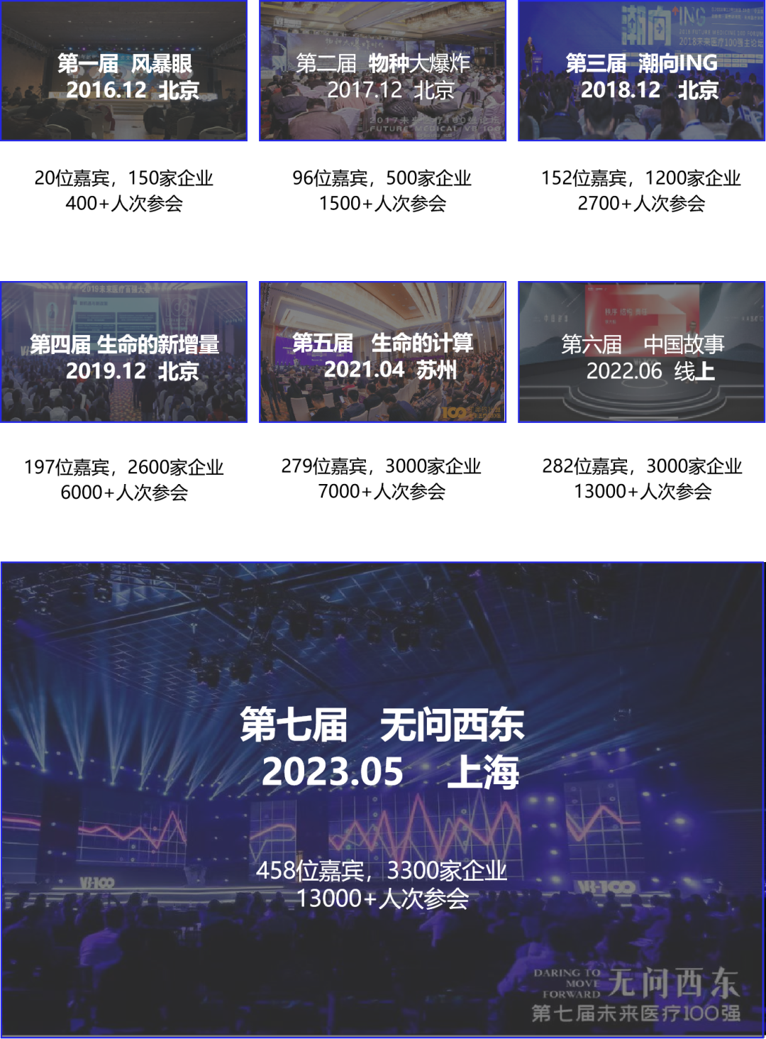 2016年,“互联网医健年度风云榜”升级为“未来医疗100强大会”,经过多年探索,未来医疗100强大会已经形成“论坛+展览+榜单/奖项”的独特复合模式,将热点领域话题和深度观点价值进行融入,打造出国内医疗健康领域里极具规模和影响力的行业盛会。从第一届的20位嘉宾、150家企业、400人次参会到累计海内外演讲嘉宾1000+位、5000+家与会企业、20000+人次参会、500W+曝光量……一路走来,未来医疗100强大会一直在成长,在变化,逐渐成为中国医健创新行业中规模最大、信息量最大的产业与资本融合的盛会。