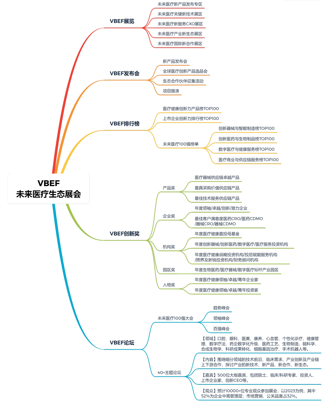 奖项迭代更新:原未来医疗100强澎橙奖、蔚澜奖合并更新为VBEF创新奖,本届创新奖根据评选主体不同,下设机构奖、企业奖、园区奖、人物奖、产品奖五大类别奖项。以VBEF创新榜单与创新奖项的发布发布为契机,汇聚500家中国医疗健康领域TOP企业与园区/投资机构汇聚。