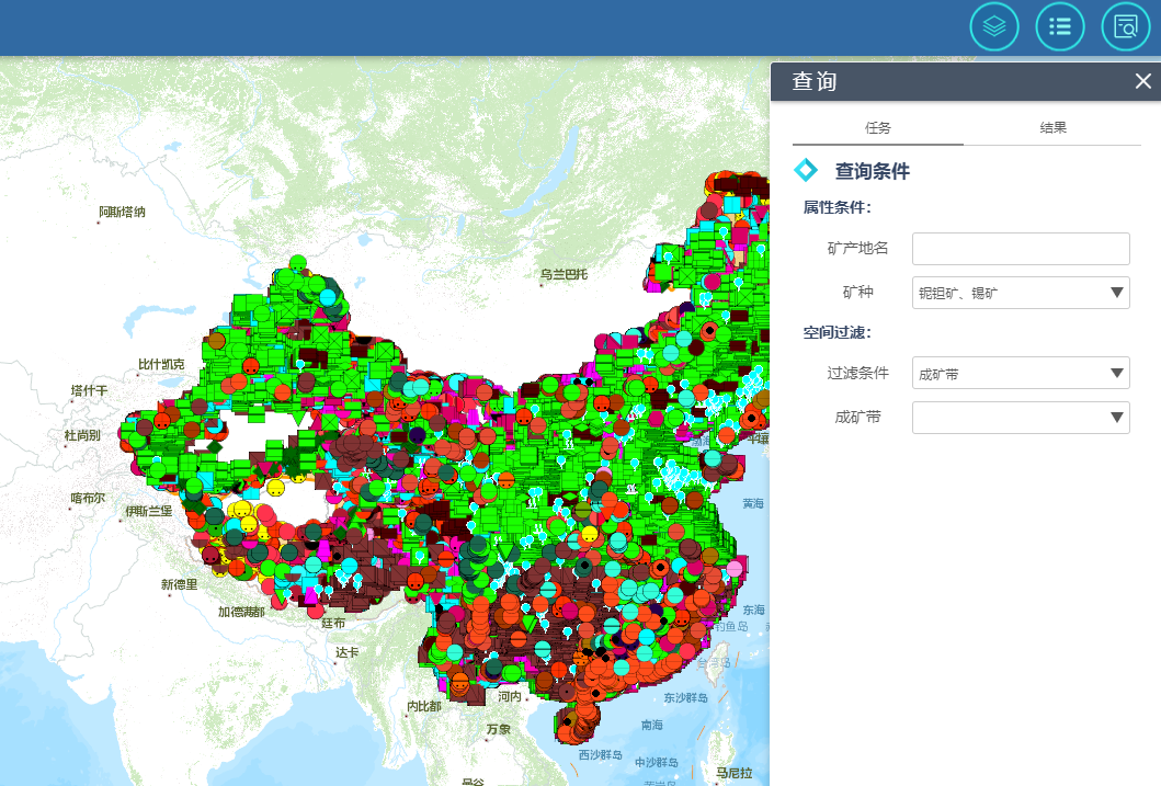 还可通过查询条件,显示所需矿种、行政区域、矿带等。