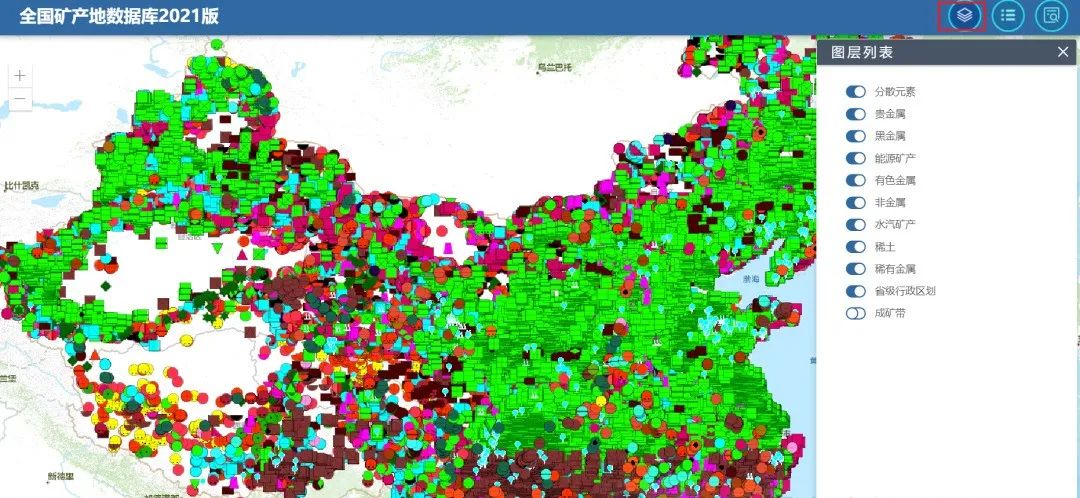 进入网站后,可以自由选择图层来展示10类不同的矿产分布