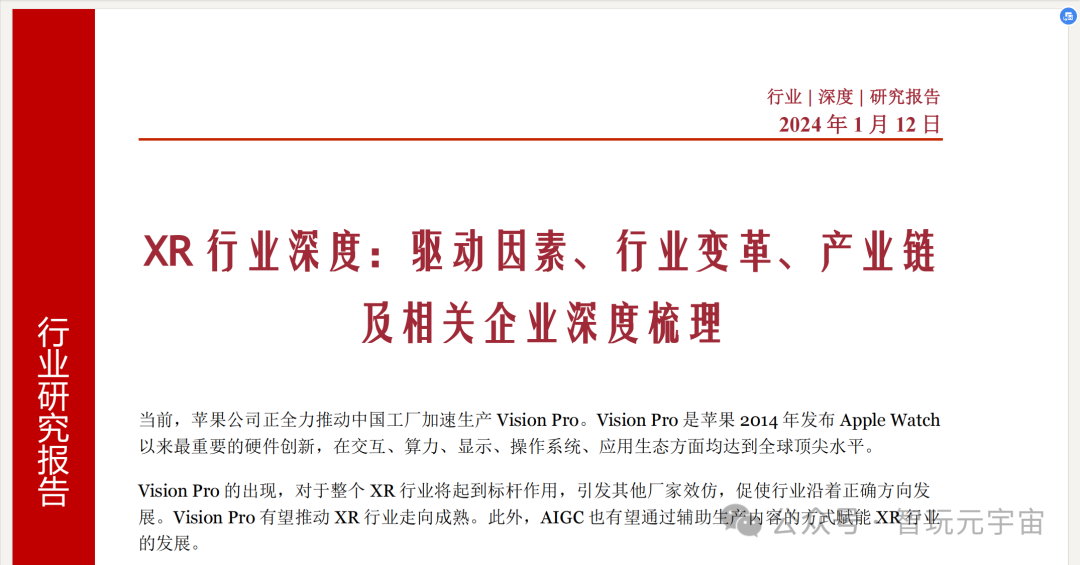 本文对XR行业进行了深度分析,主要围绕驱动因素、行业变革、产业链及相关企业深度梳理。XR行业是通过计算机技术和可穿戴设备产生的一个真实与虚拟组合、可人机交互的环境,是AR、VR、MR等多种形式的统称。XR技术能够通过计算机将真实与虚拟相结合,为体验者带来虚拟世界与现实世界之间无缝转换的“沉浸感”从而实现“进入元宇宙”。当前,苹果公司正全力推动中国工厂加速生产Vision Pro,对于整个XR行业将起到标杆作用,引发其他厂家效仿,促使行业沿着正确方向发展。展望未来,苹果入局、政策赋能、AI技术带来的应用侧革新,将在很大程度上推动行业进入高速增长的浪潮中。