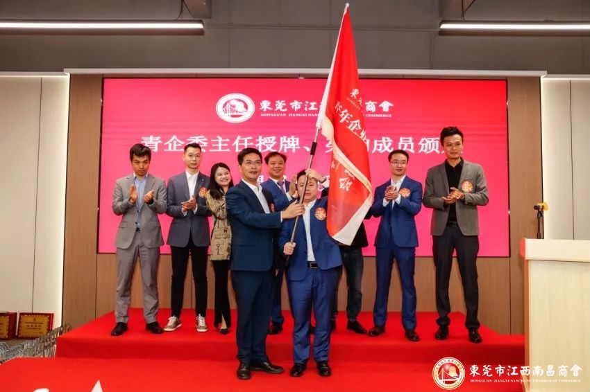 由会长程争卿向青年企业家委员会主任戴吉龙授牌。